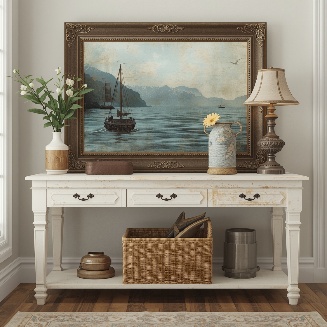 Think large-scale pieces depicting crashing waves, vintage nautical maps, or even a hand-painted ship. I once hung a simple framed photo of a sunset at a pier; every time I glance at it, I can practically smell the ocean breeze.