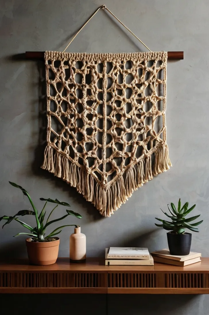 Today’s crochet wall hangings use geometric patterns and earthy tones for a bold, gallery-like effect.