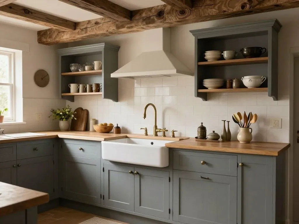 Exposed beams instantly bring that old cottage charm into a kitchen. They make the space feel grounded and full of history, even in newer homes.