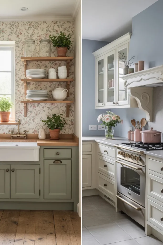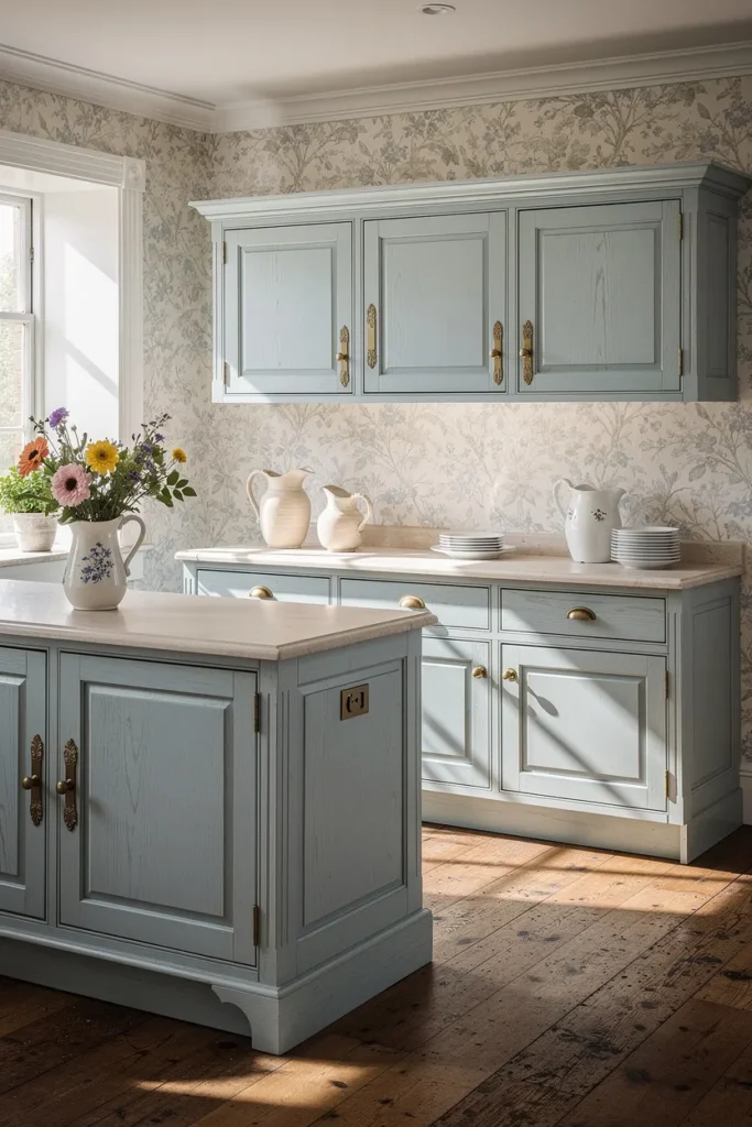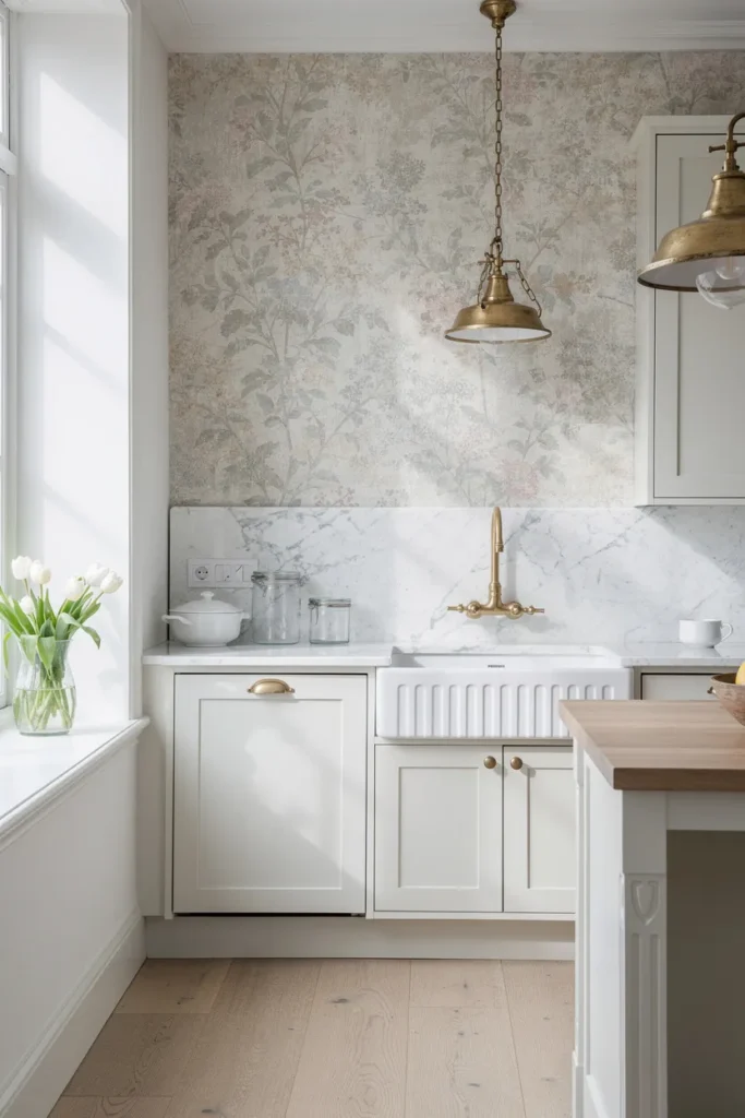 Vintage wallpaper with small florals or soft patterns adds warmth and personality to an English countryside kitchen.