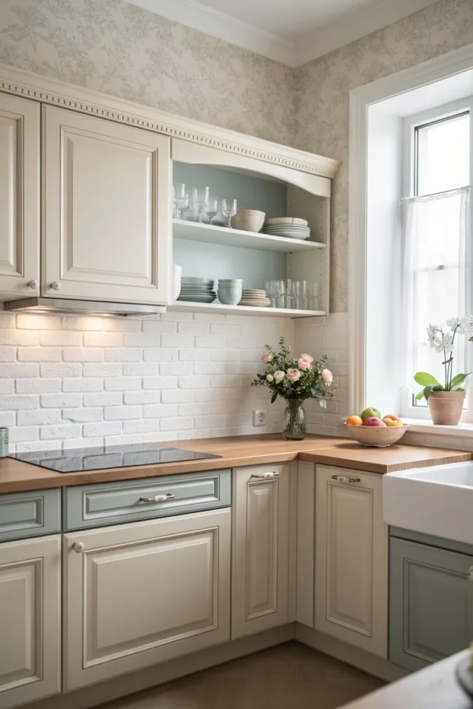 French provincial kitchens are light, soft, and quietly elegant. Nothing feels forced. The colors are gentle, the details are pretty, and everything feels comfortable rather than formal.