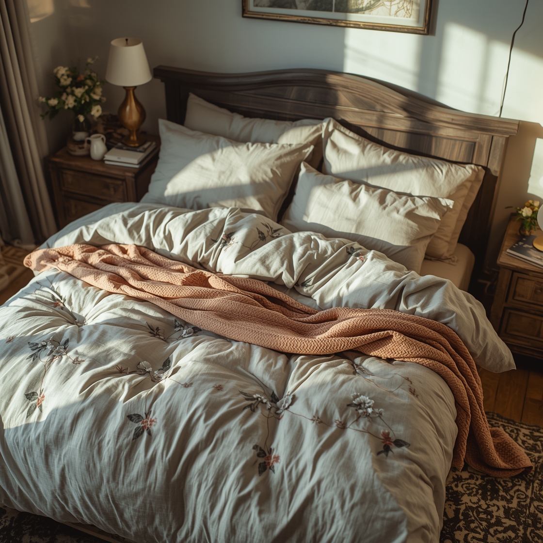 Now we’re getting into the dreamy part. Your bed should feel like a hug, but with an added touch of romantic charm. Think ruffled duvet covers in muted flower prints or cotton lace billowing in the breeze.